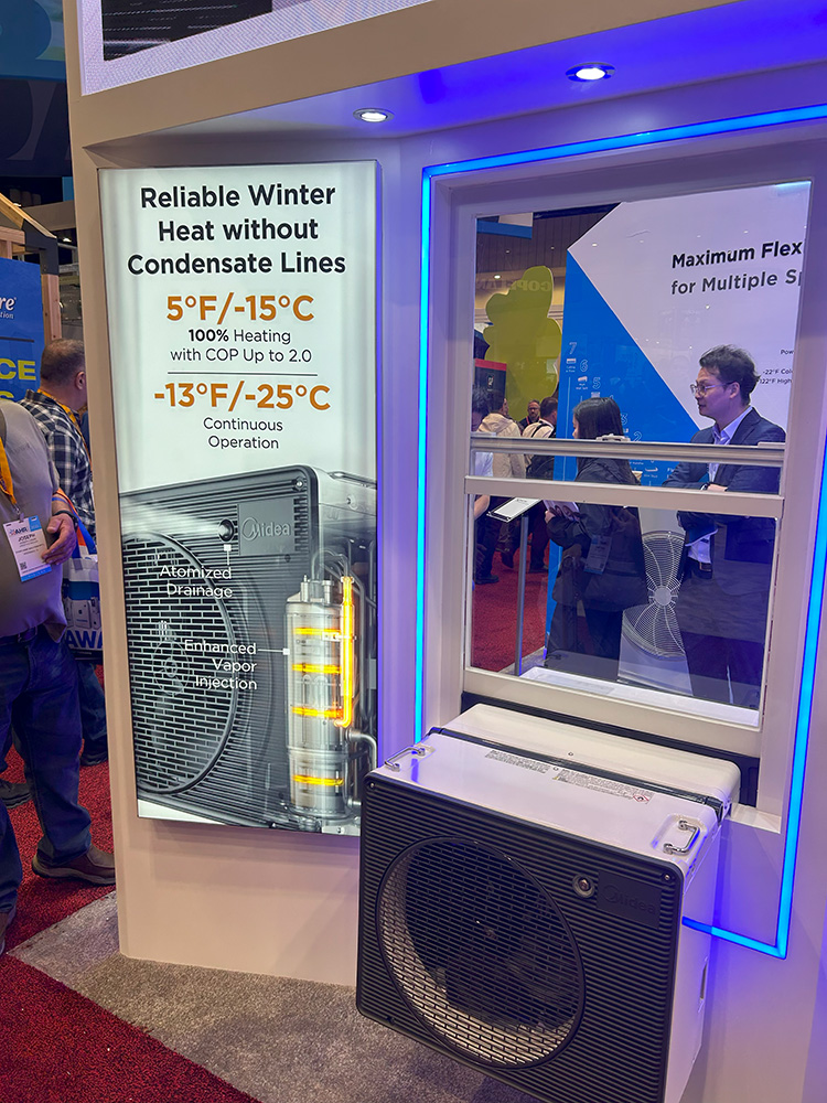 For example, because until recently all heat pumps needed to be connected to 240-volt power outlets, many customers who only have 120-volt outlets in their house have been reluctant to install heat pumps, concerned about the costs and inconvenience of upgrading their electric panels to support 240-volt outlets. However, Midea showcased a 120-volt heat pump that can be installed in a windowsill. Midea’s heat pump uses a technology called enhanced vapor injection that increases the efficiency of a heat pump’s compressors.